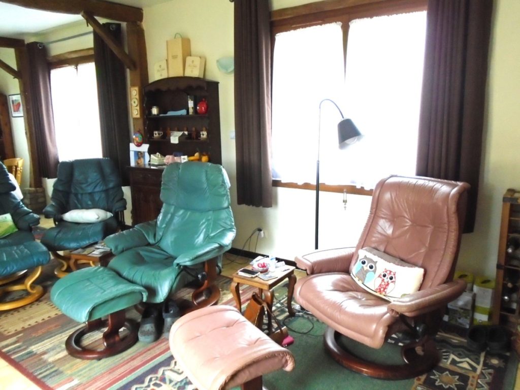 Tiled floor, windows, French doors to rear garden, radiators, beams, fireplace with log burner.