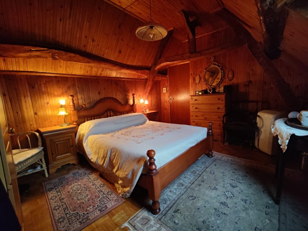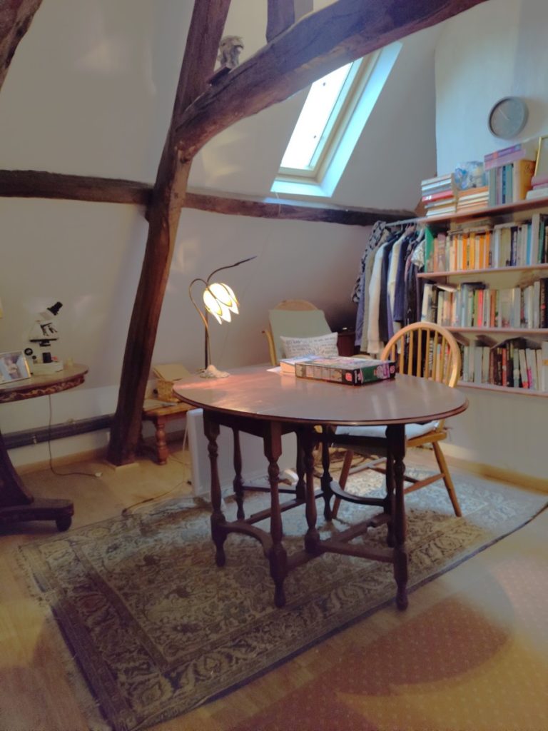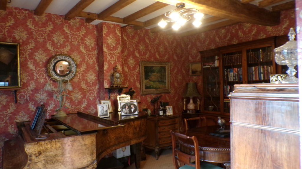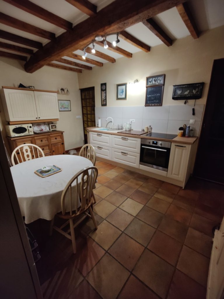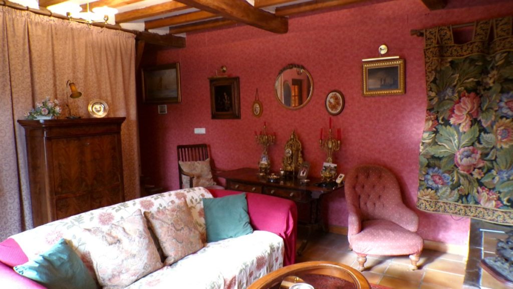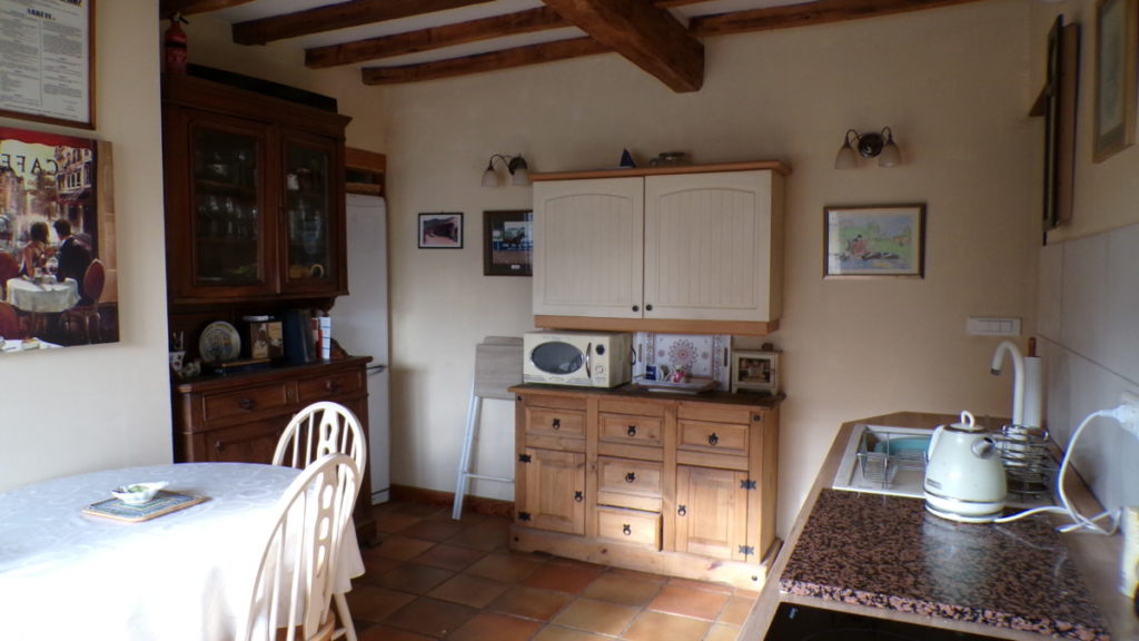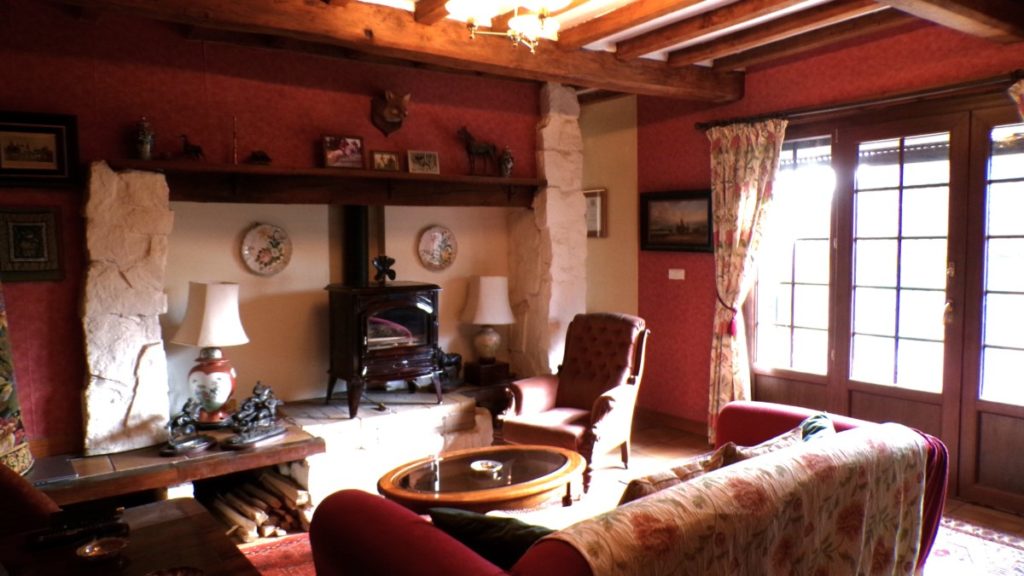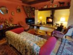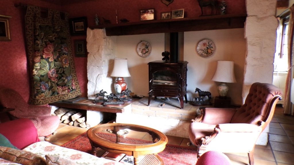 Tiled floor, beamed ceiling, triple doors to front courtyard, fireplace with log burner.
