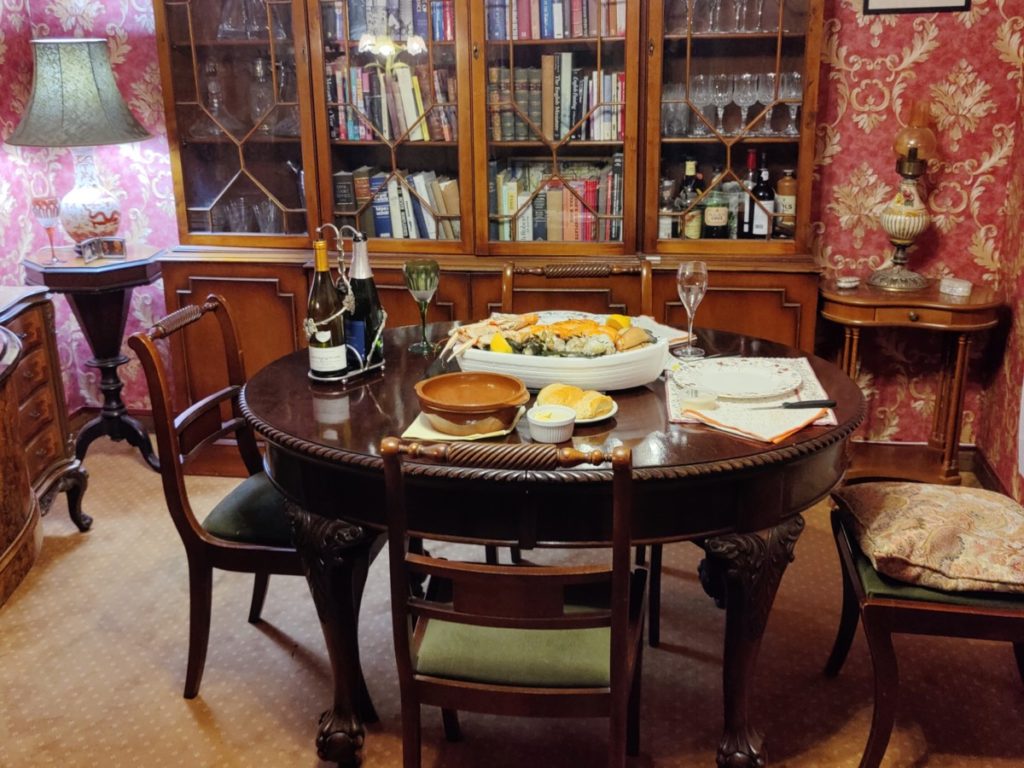 Fitted carpet, beamed ceiling, triple doors to front courtyard.