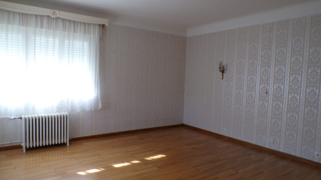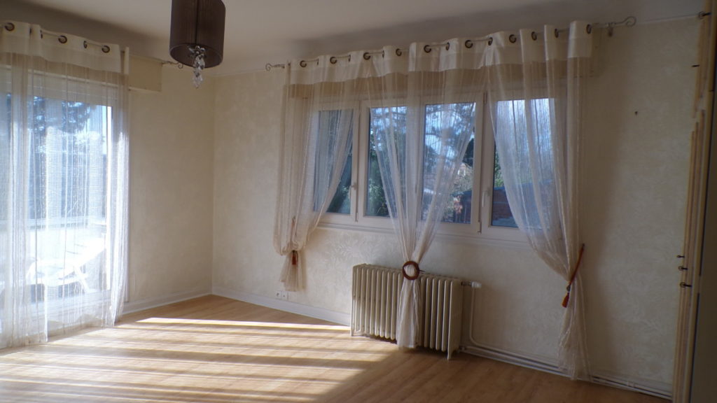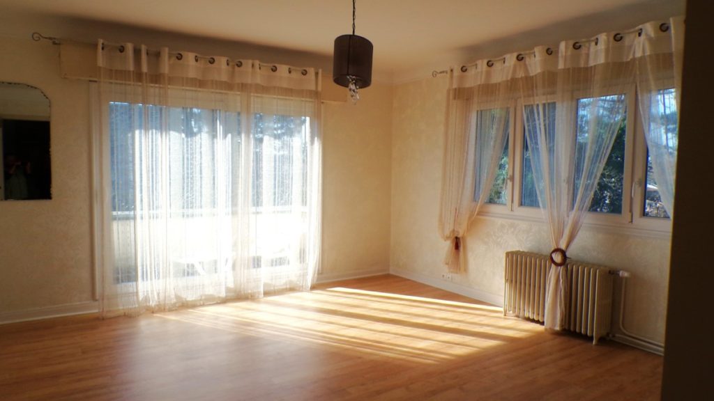 Lovely spacious room with parquet flooring, windows, sliding patio doors onto terrace, radiators, fireplace.