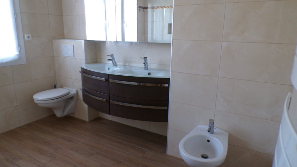 Parquet floor, window, radiator/heated towel rail, twin basins, bidet, WC.