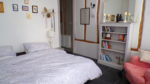 Moquette, fenêtres, cheminée, placards, radiateur.