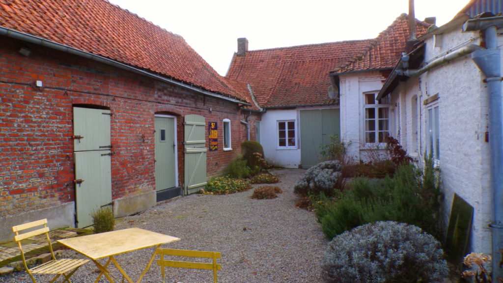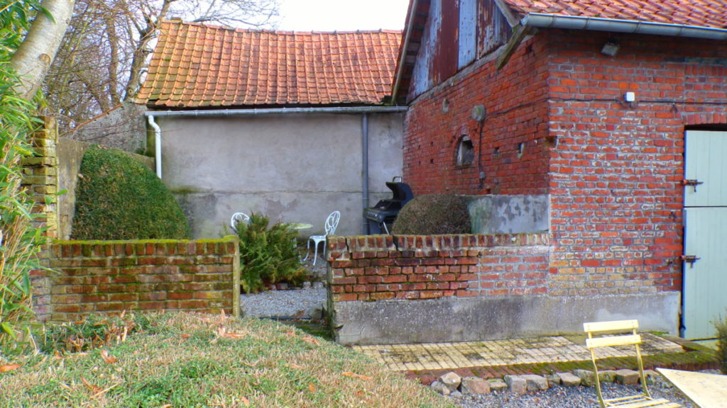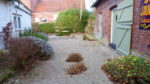 Jardin/cour clos entre les deux bâtiments. Parterres de fleurs, gravier. Réservoir de gaz. Arcade couverte/parking. Petite dépendance.
