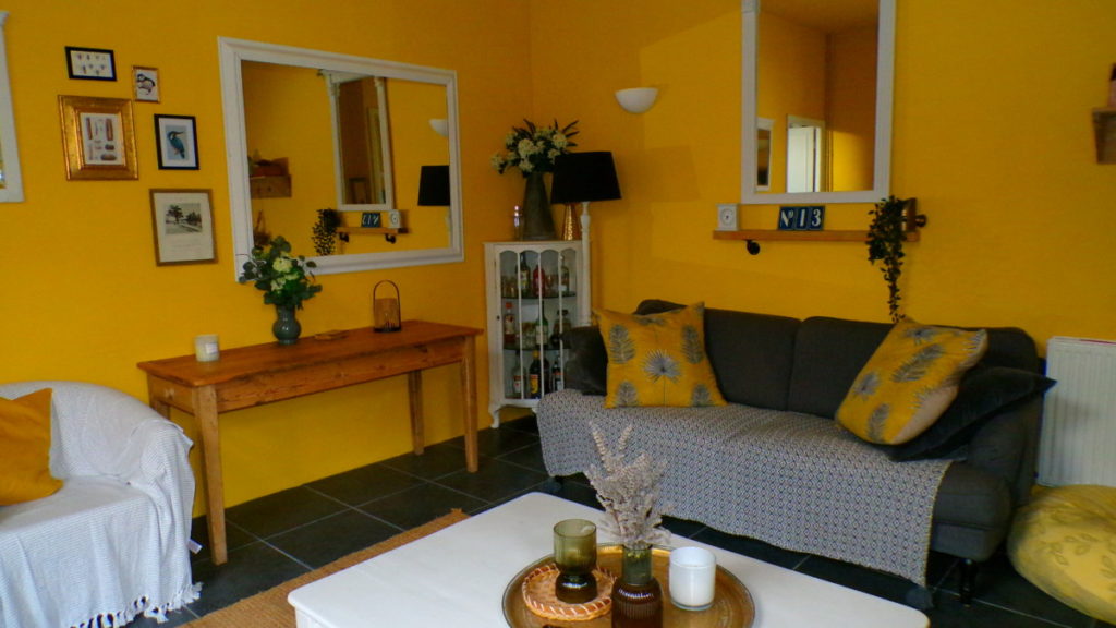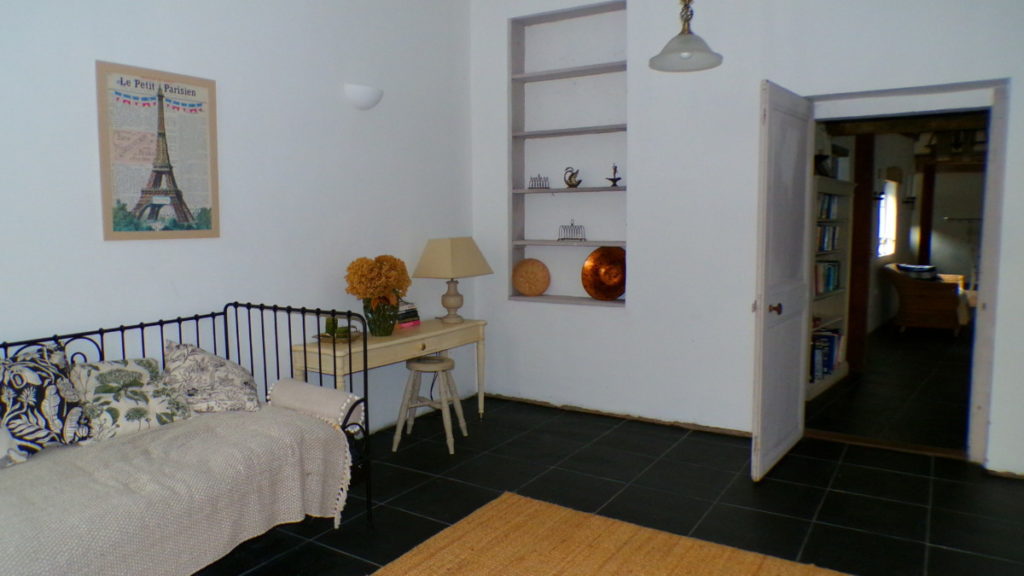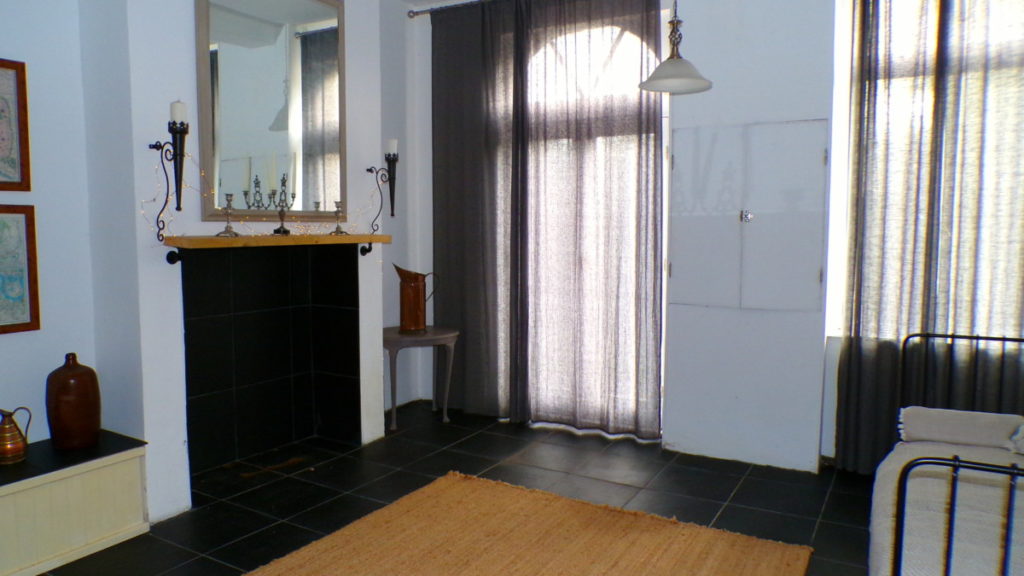 Belle grange aménagée comprenant une grande pièce ouverte avec sol carrelé, fenêtres, portes donnant sur le jardin. Grande chambre avec sol carrelé, fenêtres, cheminée.